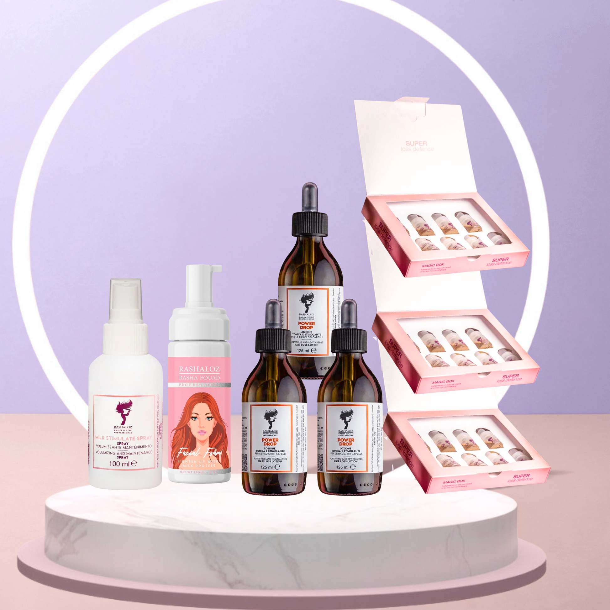 3 Boxes lavender ampules + 3 power drops +1 Face foam + 1 Milk spray